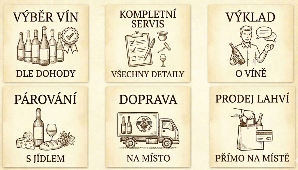 Co vás čeká: Přivezeme náš vinný koutek, profesionální sklo i chlazení. Celý večer se o vás staráme a rozléváme vína podle chuti vašich hostů.